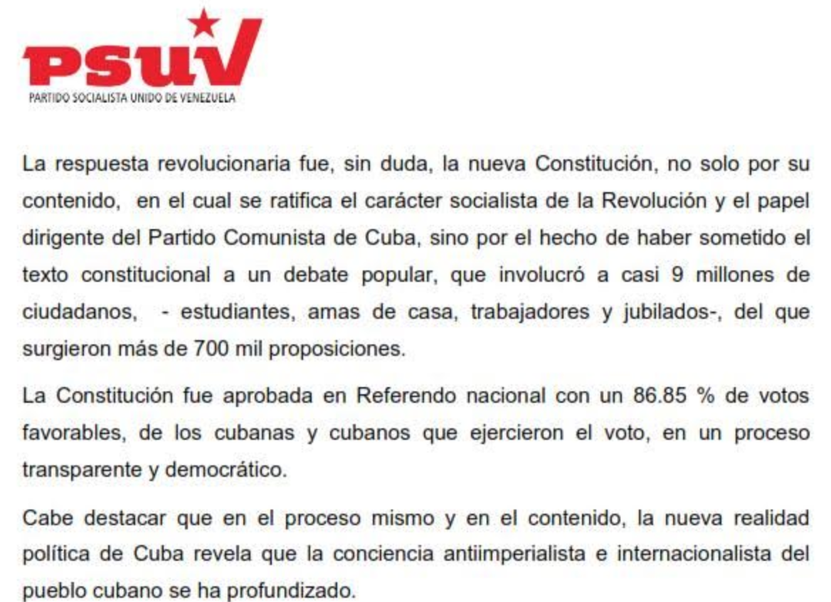 Seguidamente, el documento base se remite a Cuba, donde se “debatió” y “aprobó” una nueva Constitución que es “expresión de la democracia socialista, que avala en términos jurídicos y conceptuales las transformaciones previamente recogidas en los documentos programáticos acerca del Modelo Económico y Social de Desarrollo Socialista, adoptados en el VI y en el VII Congreso del Partido Comunista de Cuba”.