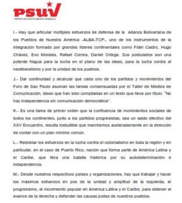 12) Trabajar desde cada país y organizaciones en pos de “la unidad y amplitud de la izquierda, el progresismo, el movimiento popular en América Latina y el Caribe, para detener el avance de la derecha y defender las causas justas de nuestros pueblos”.