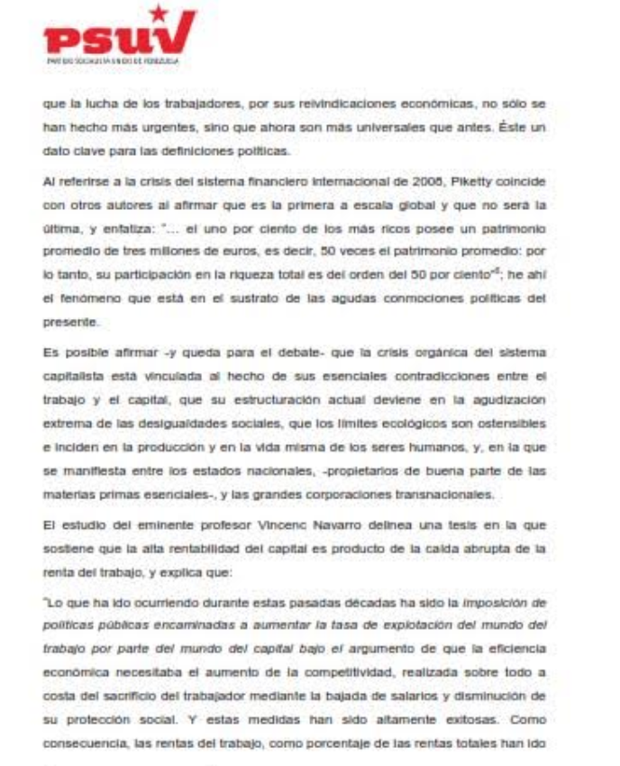Se hace mención de las experiencias de los “gobiernos progresistas” de Latinoamérica y el Caribe -aunque disímiles que supuestamente “han logrado reivindicar al ciudadano, distribuir el ingreso de manera progresiva, recuperar el rol del Estado en la conducción de la economía y el desarrollo de políticas públicas de alto impacto dirigidas a abatir la pobreza extrema” en oposición “al recetario neoliberal del Fondo Monetario Internacional, cuya política no sólo afecta la vida de las mayorías, sino que está demostrada su inviabilidad como generadora de consensos, y por el contrario, ensancha la brecha social entre el 1 % de los llamados ̔súper-ricos̓ y el resto de los seres humanos”.