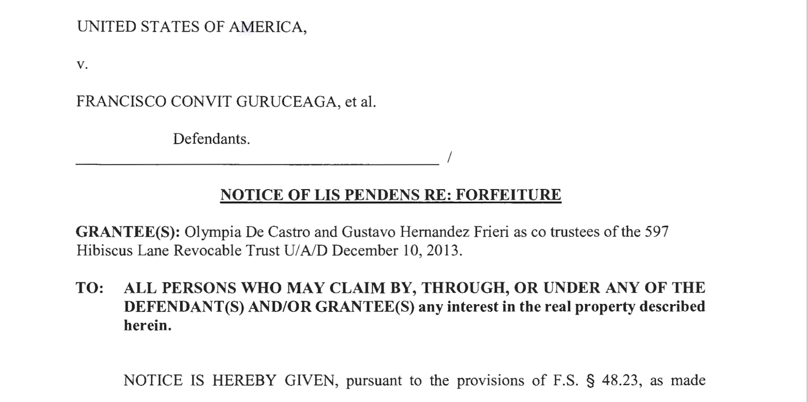 La segunda propiedad confiscada está a nombre de Olympia De Castro y Gustavo Hernandez Frieri ubicada en 597 Hibiscus Lane, Miami, Florida 33137.