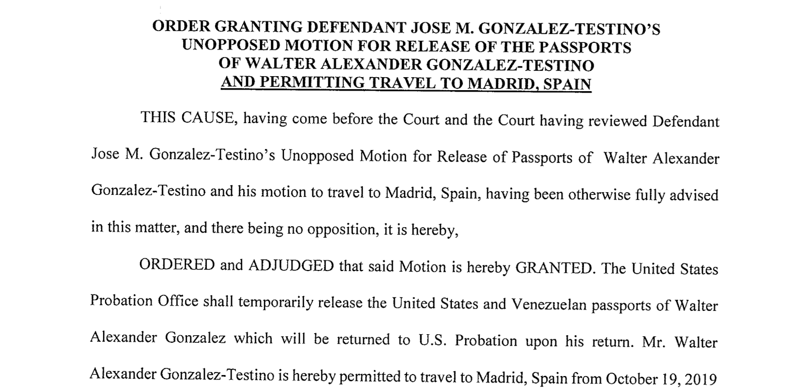 También se le otorgó un permiso de viaje a Walter Alexander González Testino para ir a Madrid del 19 al 27 de octubre de 2019, para lo cual se le devolvieron temporalmente los pasaportes venezolano y estadounidense.
