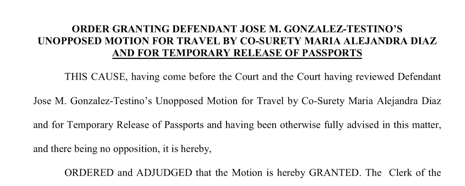En las últimas acciones que se han tomado en el expediente criminal de González Testino aparece una orden aprobada por el juez para la liberación temporal de los pasaportes venezolano y norteamericano de María Alejandra Díaz para realizar un viaje fuera del territorio estadounidense. La orden fue dada el 13 de septiembre de 2019.