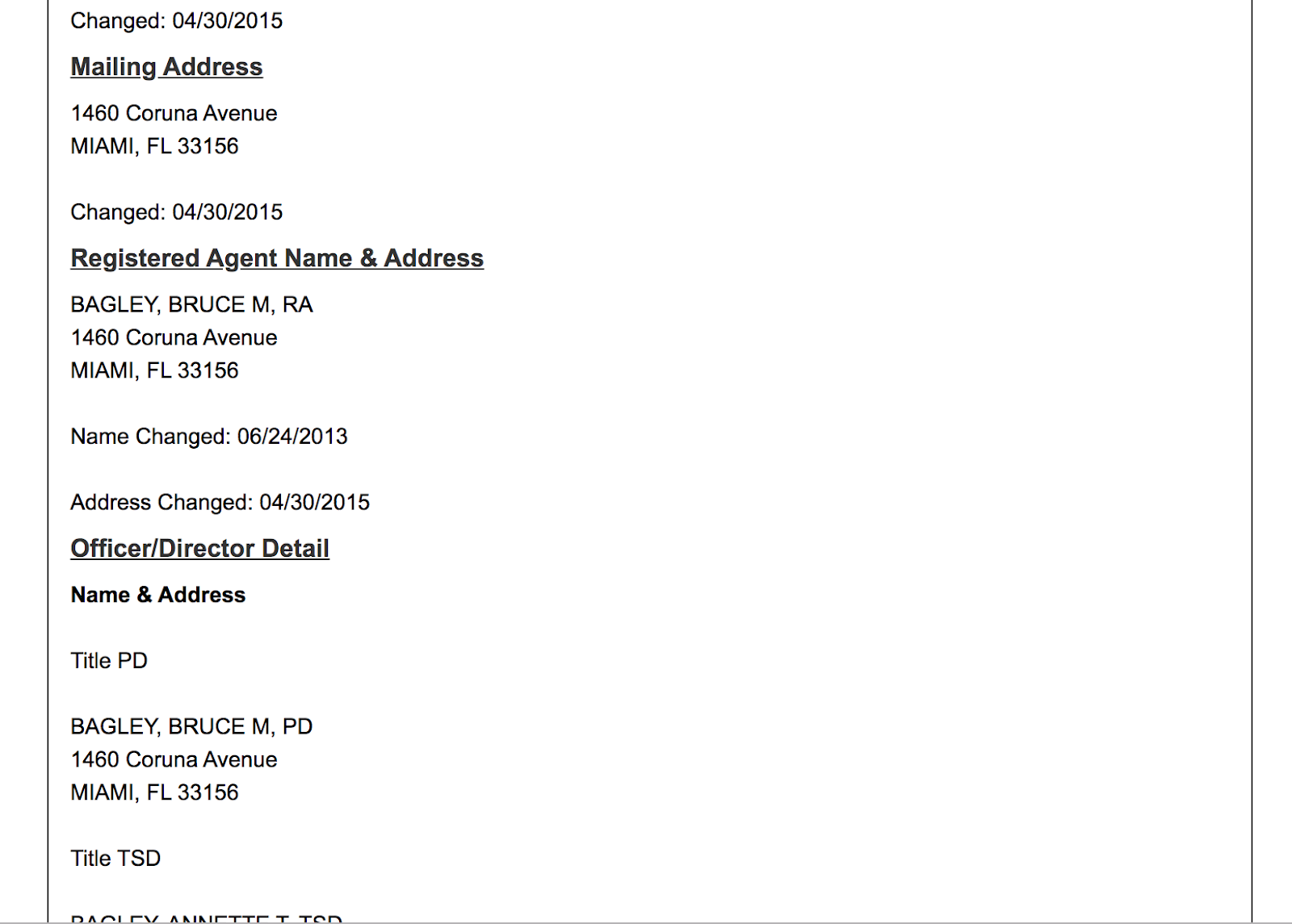 Los récords del estado de la Florida muestran la empresa Bagley Consultants, INC. # P05000015118 creada el 28 de enero de 2005 y cerrada administrativamente (por no presentar el reporte anual) el 22 de septiembre de 2017.