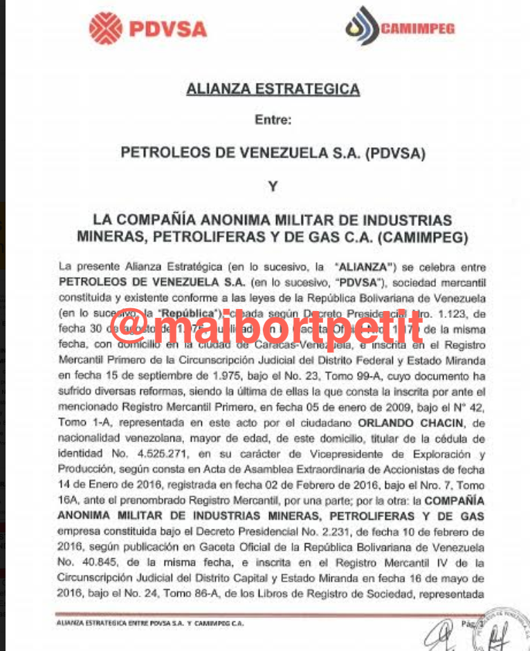 El 7 de octubre de 2016, el mayor general Alexander Hernández Quintana, presidente de la Compañía Anónima Militar de Industrias Mineras, Petrolíferas y de Gas (Camimpeg), y el vicepresidente de Exploración y Producción de Petróleos de Venezuela S.A. (PDVSA), Orlando Chacín, suscribieron una alianza estratégica que tenía por objeto y alcance —de acuerdo a lo que reza el artículo I— desarrollar todos los esquemas que puedan existir entre ambas empresas para poder ejecutar los planes de incremento de producción de PDVSA.