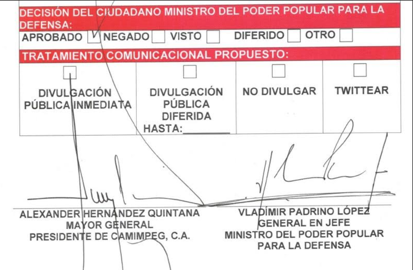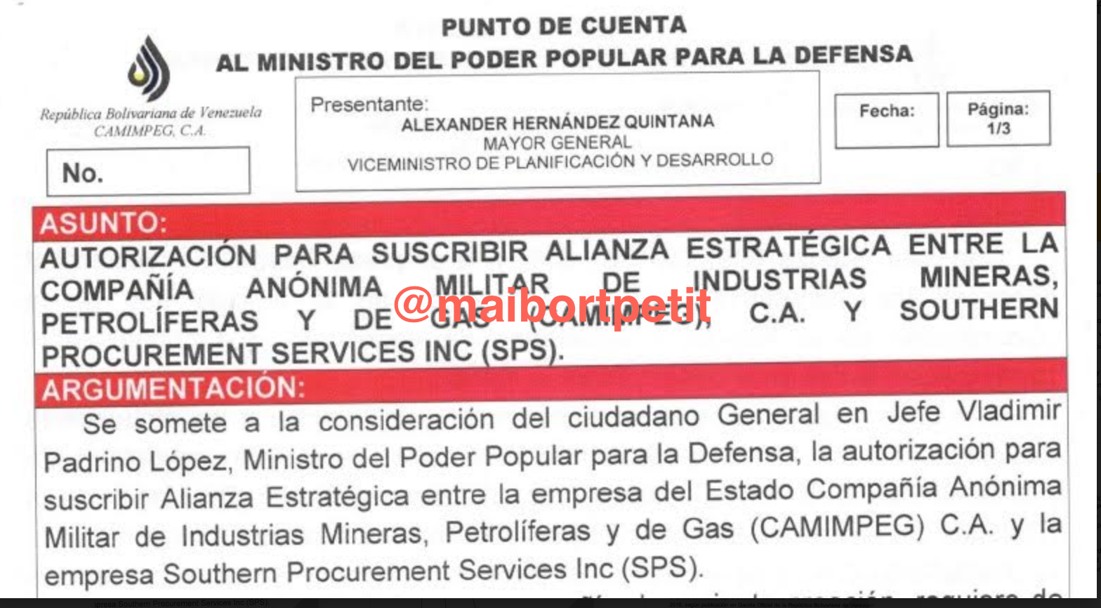 En punto de cuenta presentado por el Alexander Hernández Quintana, presidente de Camimpeg C.A. y viceministro de planificación y desarrollo al ministro del poder popular de la Defensa, Vladimir Padrino López, se solicitó autorización para suscribir la alianza entre la Compañía Anónima Militar de Industrias Mineras, Petrolíferas y de Gas y Southern Procurement Services Inc (SPS).
