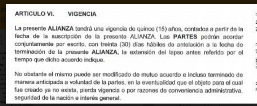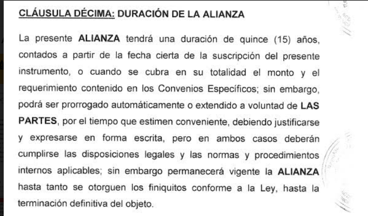 La cláusula décima estableció la duración de la alianza, indicándose que esta sería de 15 años contados a partir de la fecha cierta de su suscripción o cuando se cubriera en su totalidad el monto y el requerimiento contenido en los convenios específicos. Se previó la posibilidad de prorrogar la alianza automáticamente o de extenderlo a voluntad de las partes por el tiempo que lo estimaren conveniente.