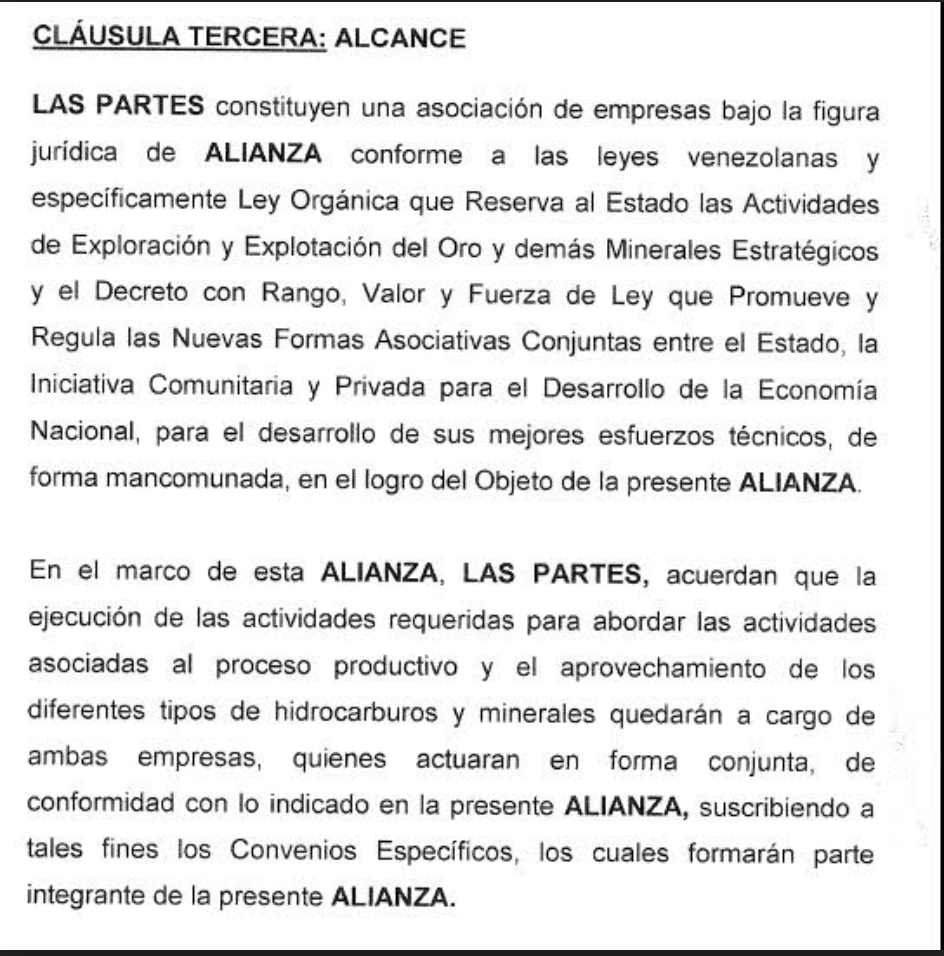 La cláusula tercera indica que Camimpeg y SPS se acogen a la figura jurídica de la alianza para establecer la asociación entre ambas empresas, de acuerdo a lo estipulado en la Ley Orgánica que Reserva al estado las Actividades de Exploración y Explotación del Oro y demás Minerales estratégicos y el Decreto con Rango, Valor y Fuerza de Ley que promueve y Regula las Nuevas Formas Asociativas Conjuntas entre el estado, la Iniciativa Comunitaria y Privada para el desarrollo de la Economía Nacional.