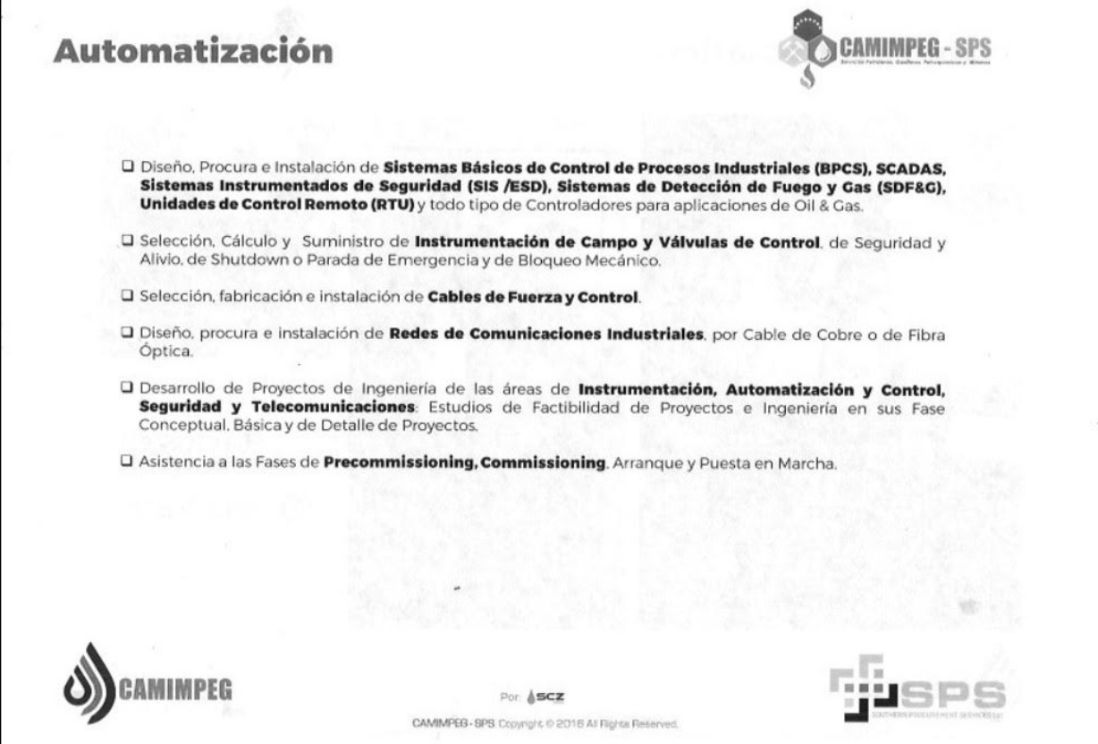 La alianza Camimpeg-SPS se promocionaba especialistas en diseño, procura e instalación de sistemas básicos de control de procesos industriales (BPCS), Scadas, sistemas instrumentados de seguridad (SIS-ESD), sistemas de detección de fuego y gas, así como de todo tipo de controladores para aplicación de oil y gas.