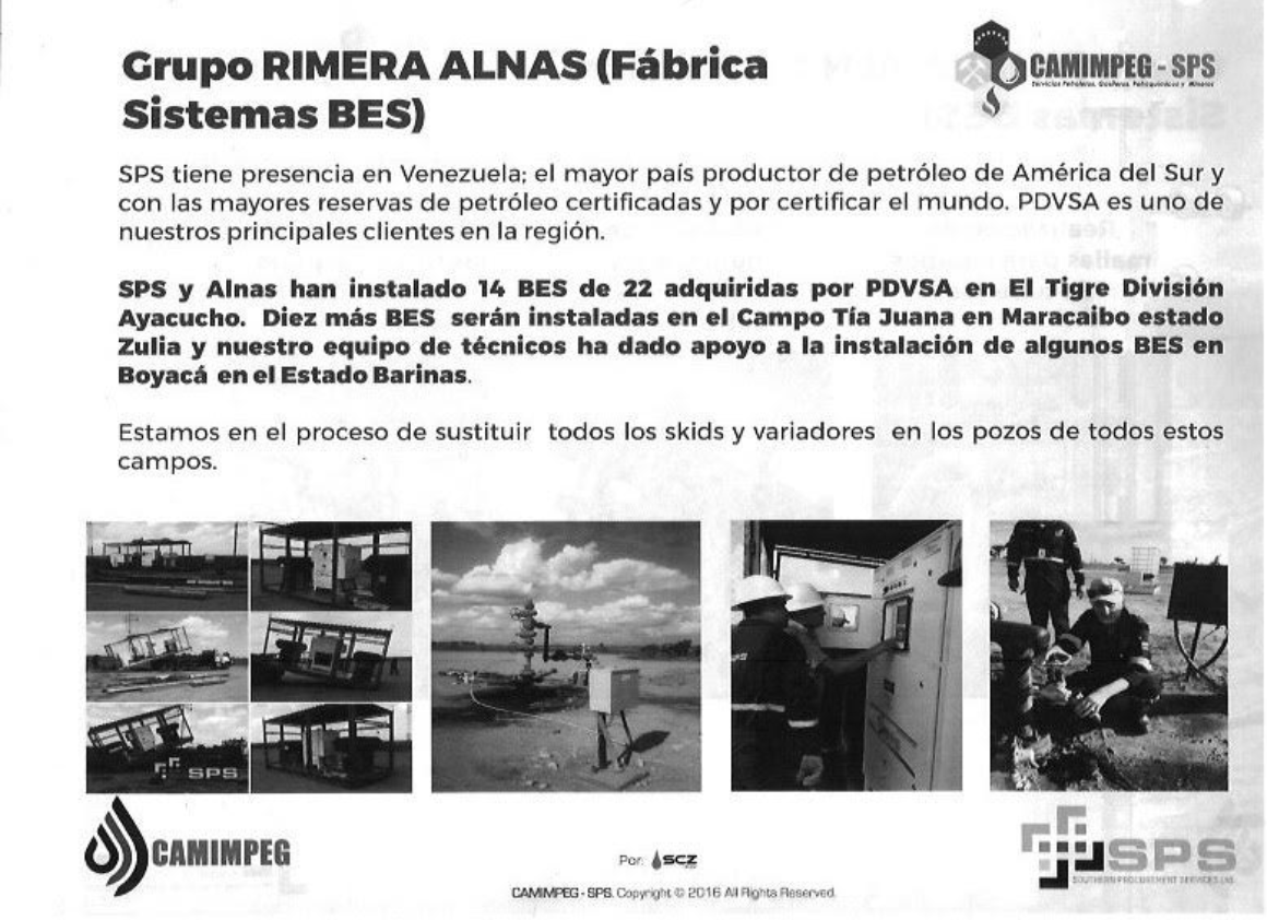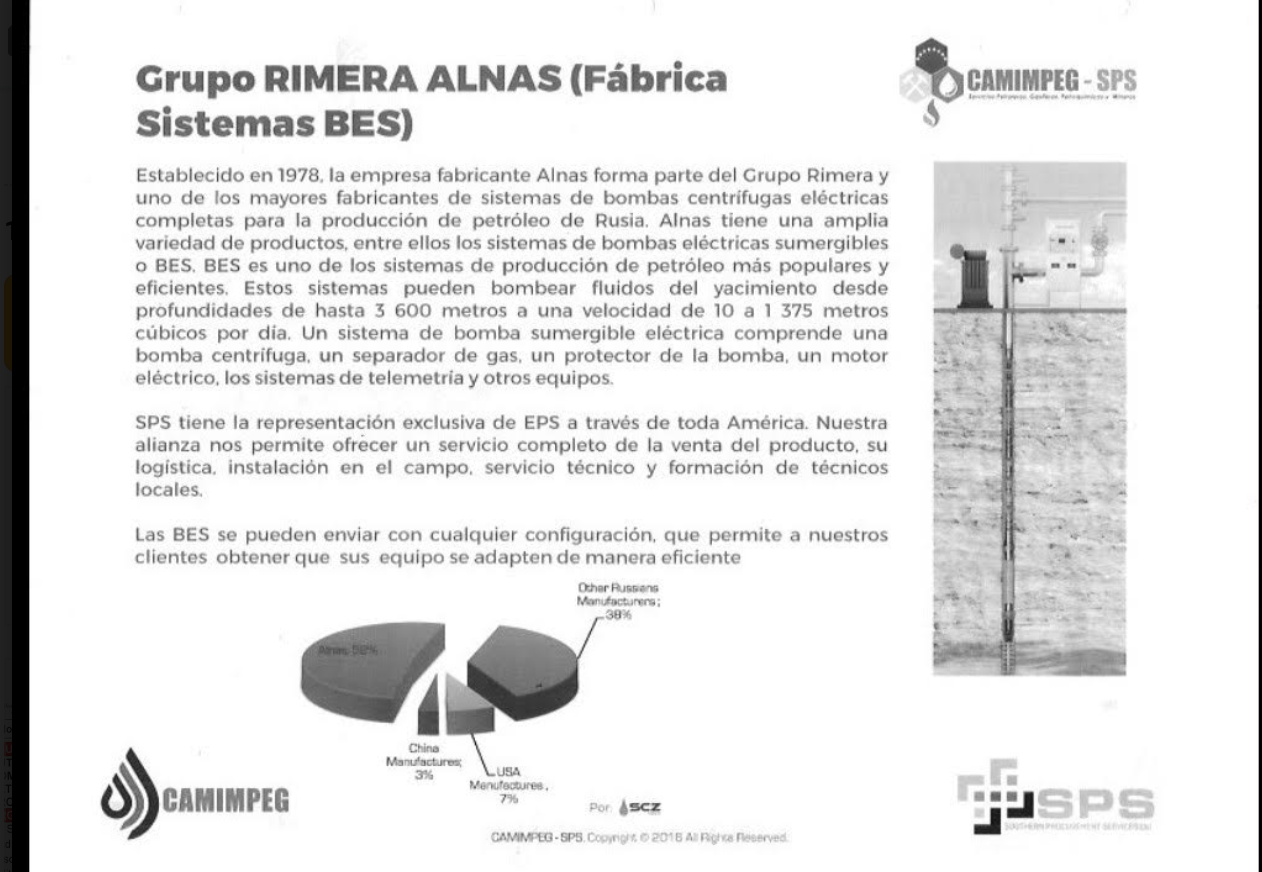 SPS aseguraba ser representantes del Grupo Rimera Alnas dedicada a la fabricación de bombas centrífugas eléctricas completas para la producción de petróleo de Rusia.