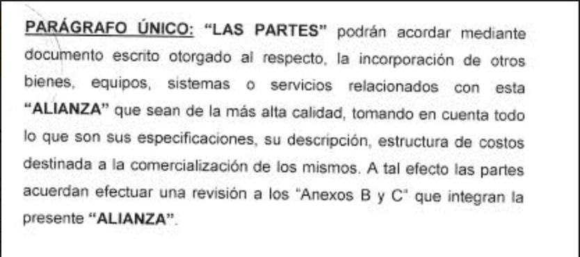 Esta cláusula contiene un parágrafo único que advierte que las partes pueden acordar en otro documento escrito la incorporación de otros bienes, sistemas o servicios relacionados con la alianza que sean de más alta calidad, tomando en cuenta especificaciones, descripción, estructura de costos destinada a la comercialización de los mismos.