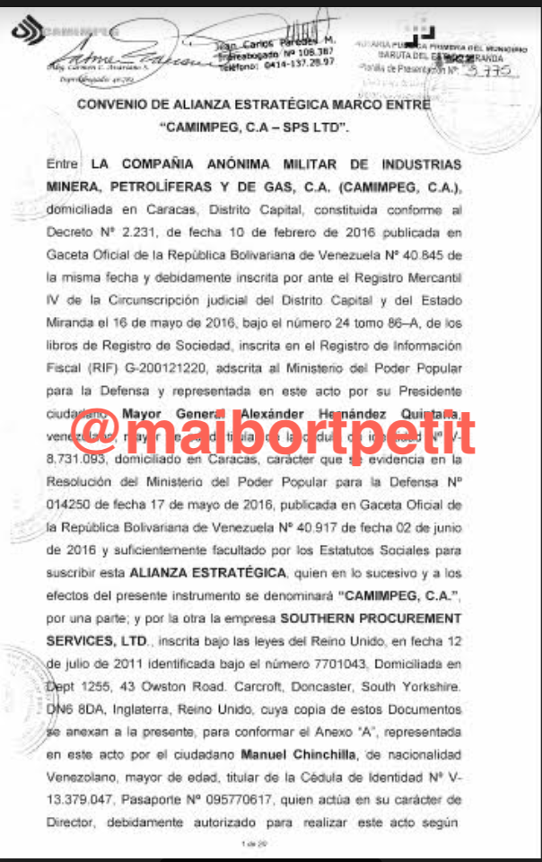 El 25 de julio de 2016, el mayor general Alexander Hernández Quintana, presidente de la Compañía Anónima Militar de Industrias Mineras, Petrolíferas y de Gas (Camimpeg), por una parte, y Manuel Chinchilla, director de Southern Procurement Services Inc (SPS), por la otra, suscribieron el Convenio de Alianza estratégica marco entre ambas empresas, para “la procura de tecnología de punta, la ejecución de proyectos asignados que permitan la adquisición, prestación de servicios, ejecución de obras, suministro de materiales y equipos para el desarrollo de la exploración y producción en las áreas de petróleo, petroquímica, telecomunicaciones, gas y construcción civil”.