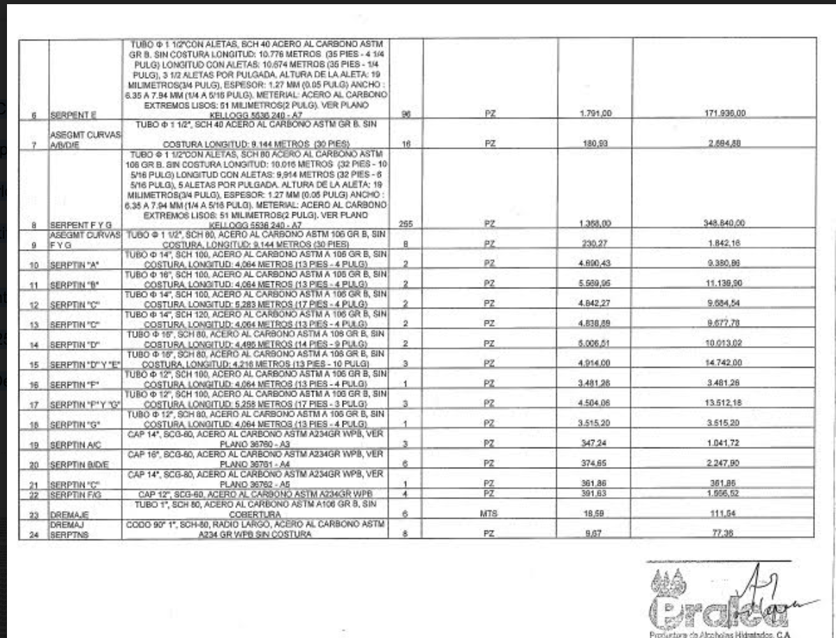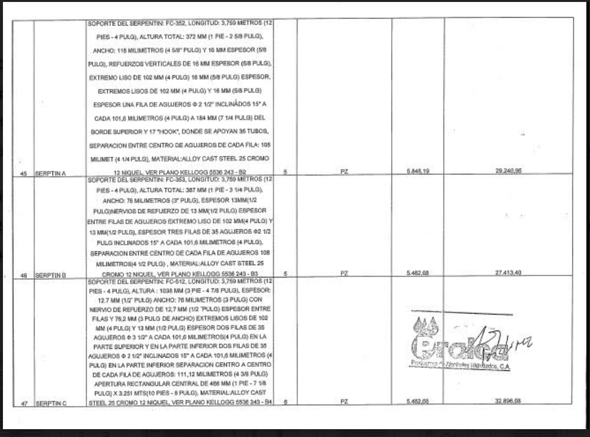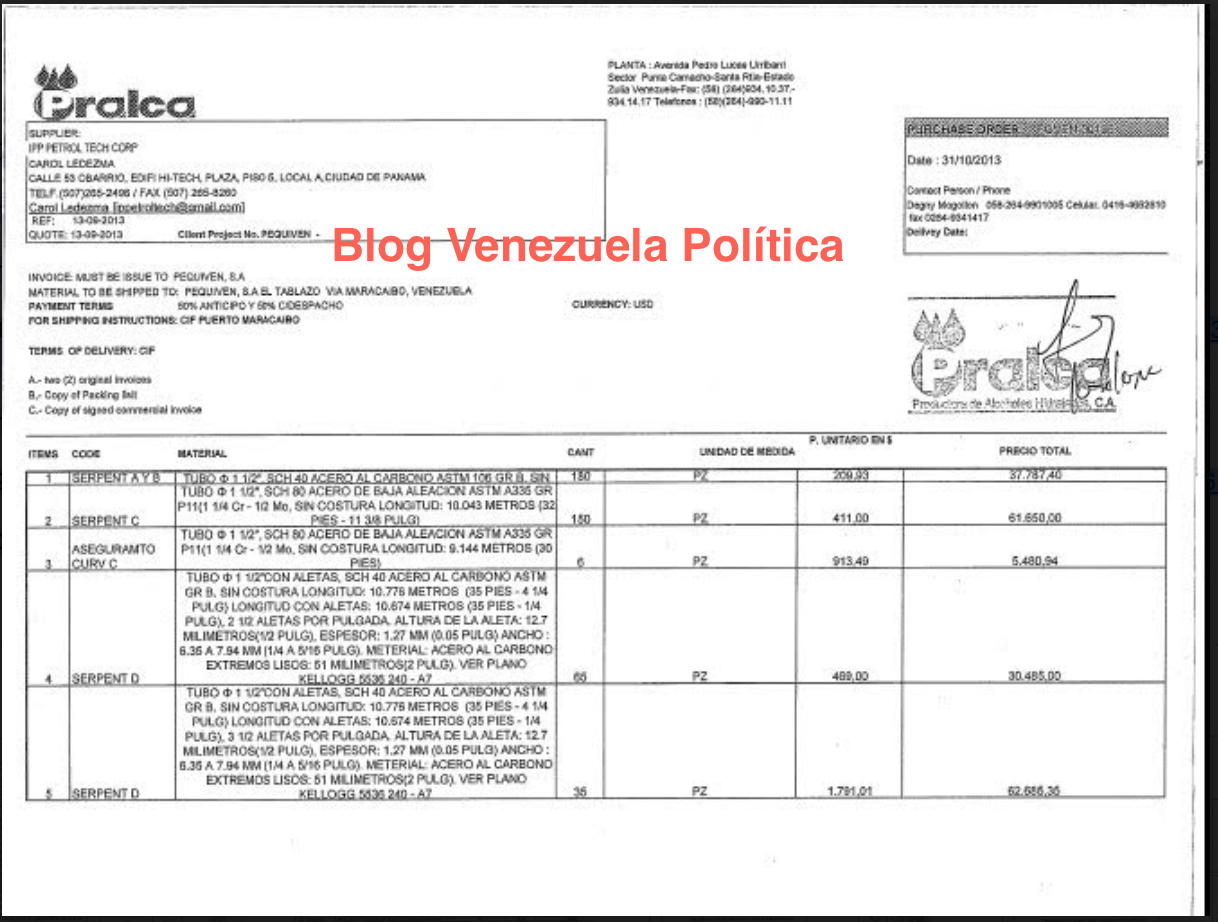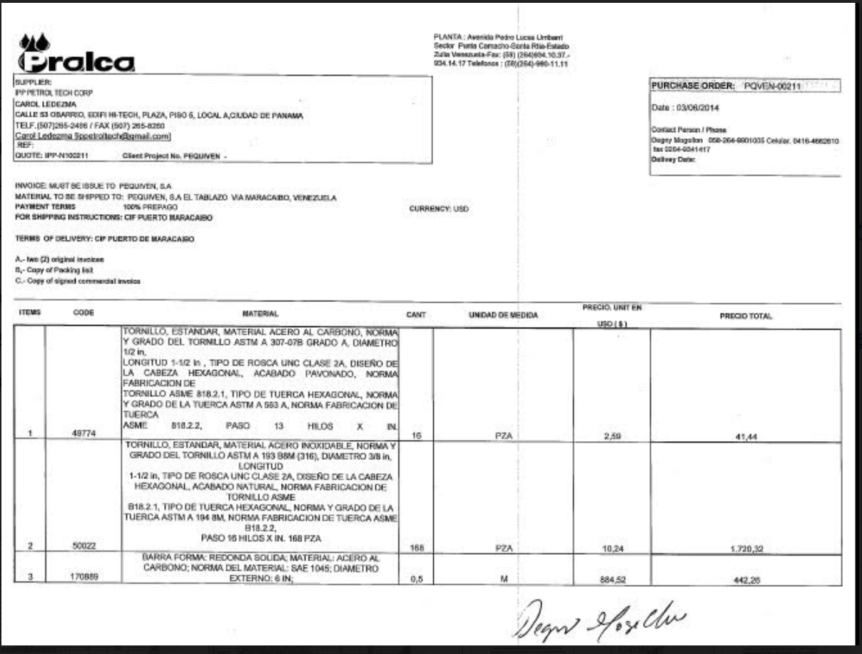 Otra orden de compra identificada con el código PQVEN-00211 llegada a nuestras manos indica que el 3 de junio de 2014, Pralca solicitó a la empresa IPP Petrol Tech Corp., una serie de repuestos igualmente destinados a reparar la caldera 103BB de la planta de olefinas del Complejo Petroquímico Ana María Campos.