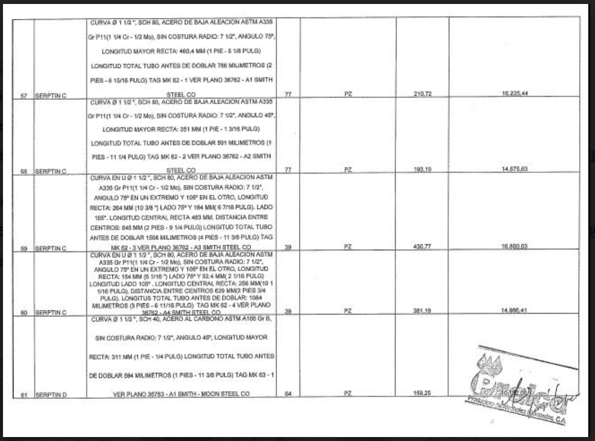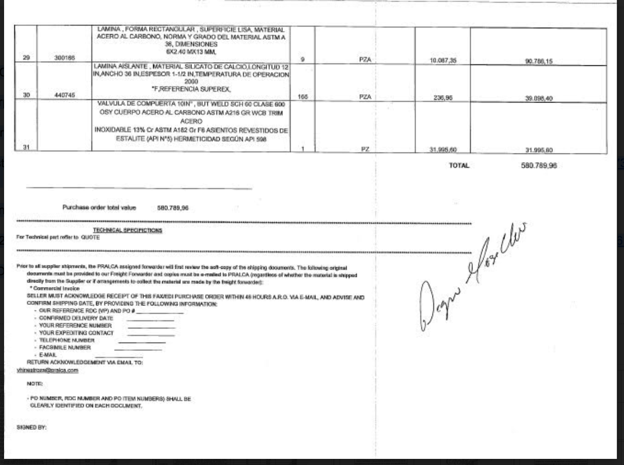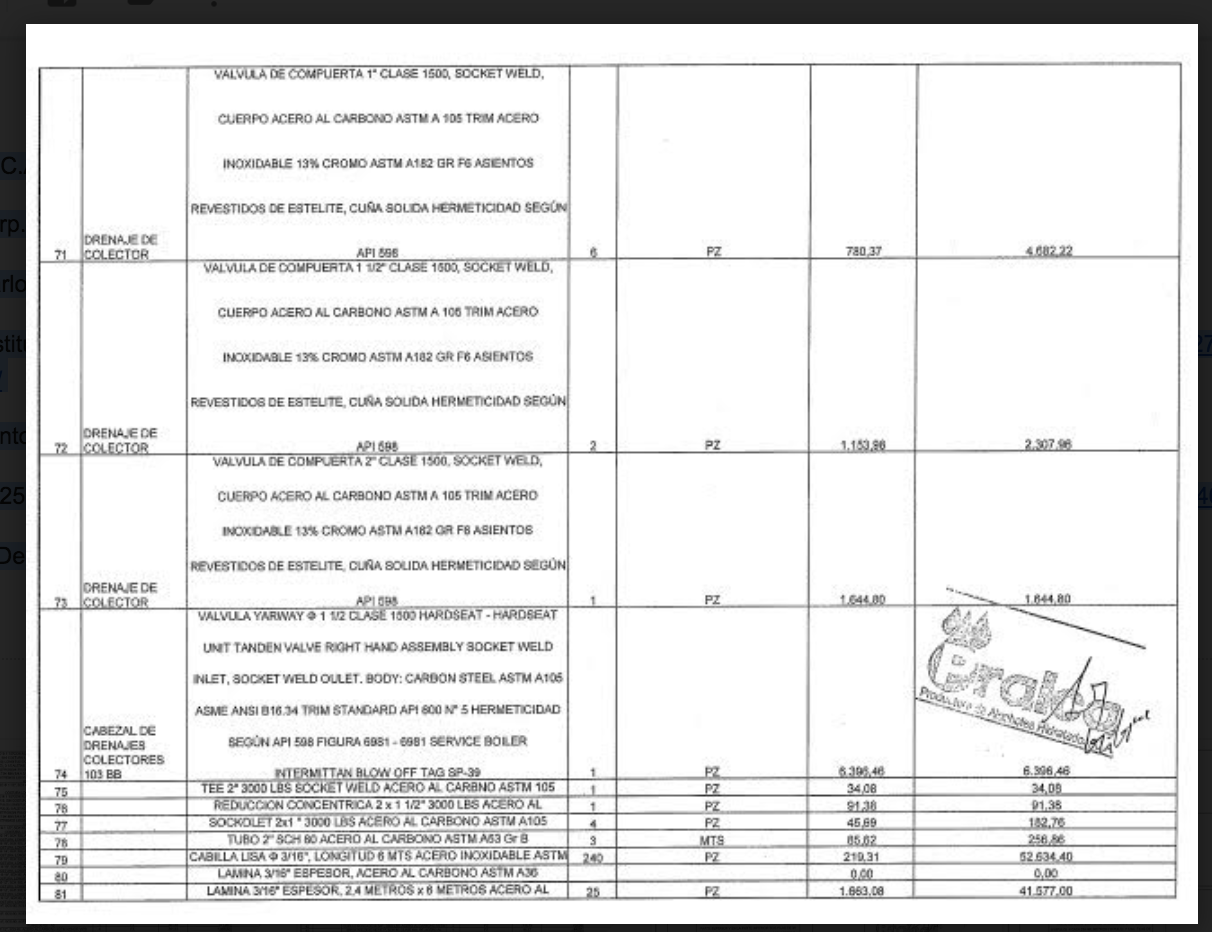 Otra orden de compra identificada con el código PQVEN-00211 llegada a nuestras manos indica que el 3 de junio de 2014, Pralca solicitó a la empresa IPP Petrol Tech Corp., una serie de repuestos igualmente destinados a reparar la caldera 103BB de la planta de olefinas del Complejo Petroquímico Ana María Campos.