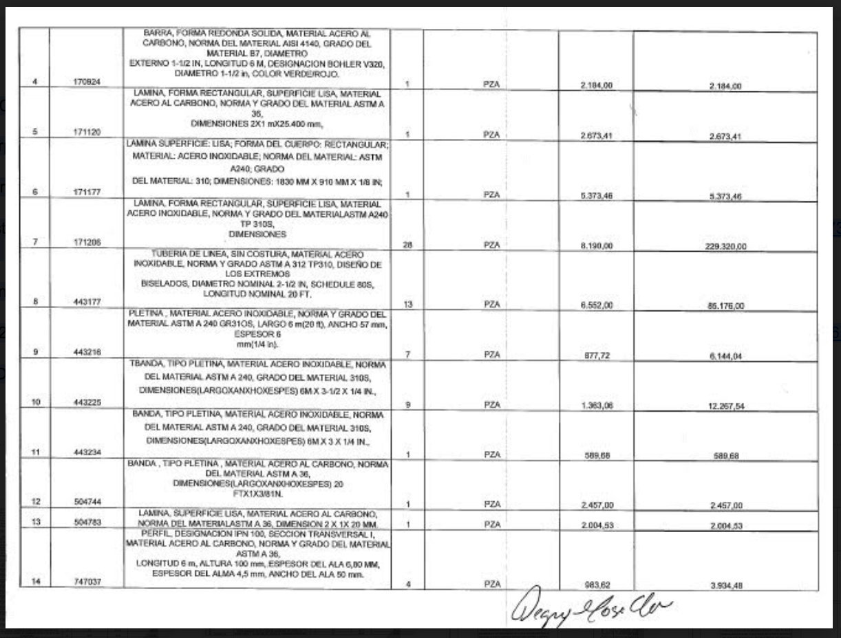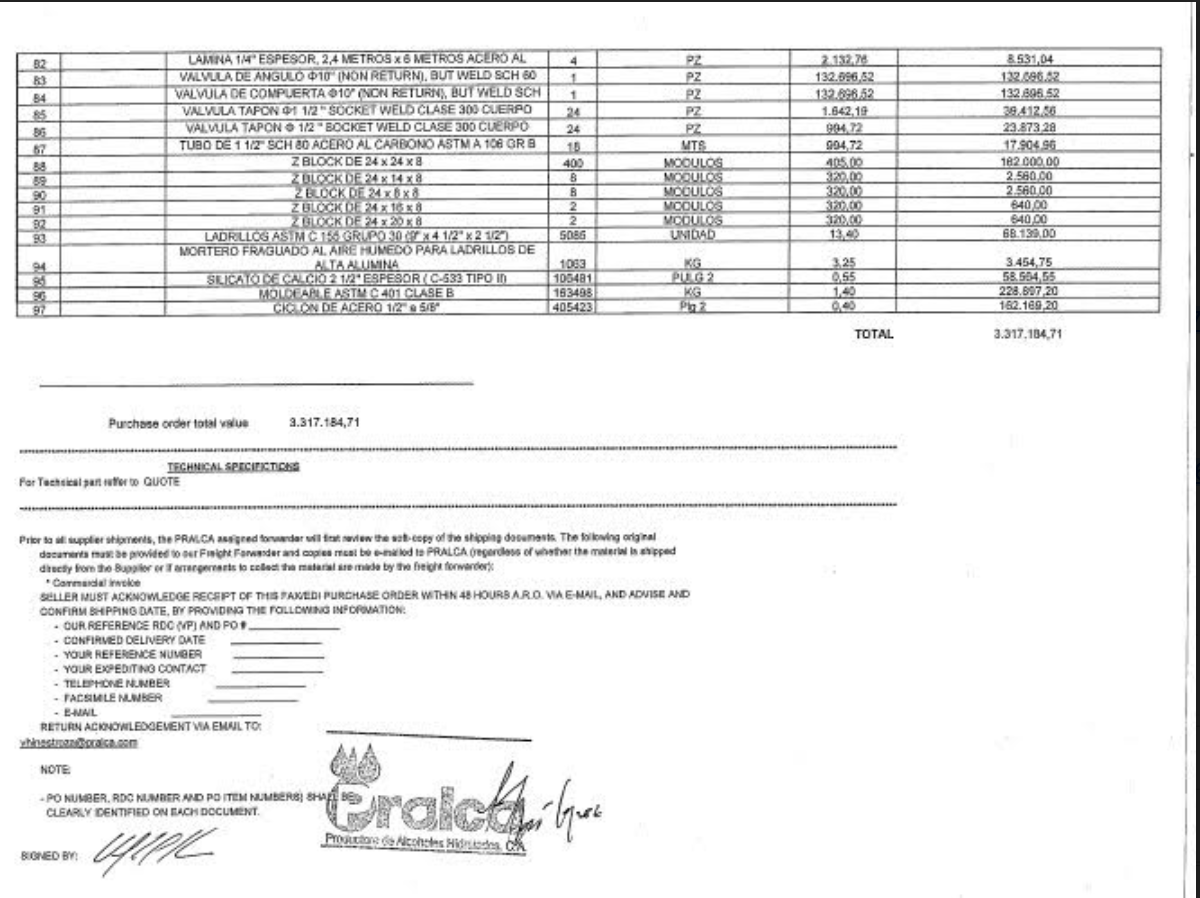 Esta orden de compra totalizaba USD 3.317.184,71 los cuales debían cancelarse un 50 por ciento de anticipo y el restante 50 por ciento con la entrega de la mercancía.