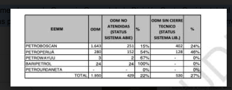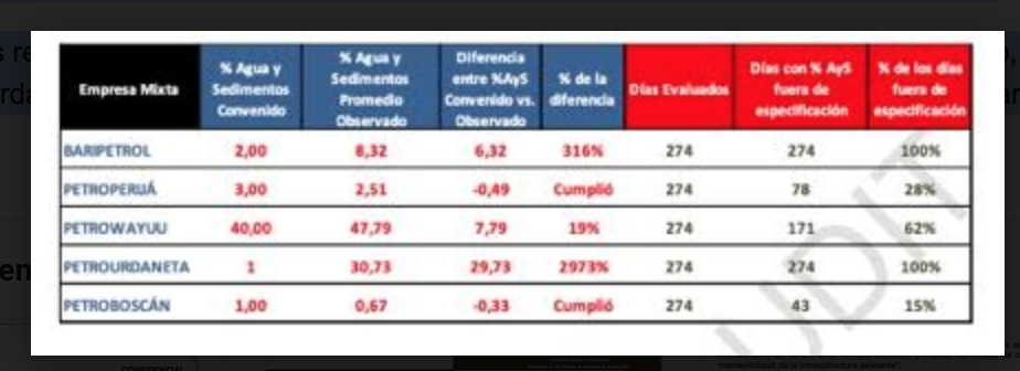La auditoría determinó diferencias respecto a lo convenido que, en el caso de Baripetrol era de 316 por ciento; en Petrowayuu era de 19 por ciento; y en Petrourdaneta era de 2973 por ciento. Se evidenció cumplimiento por parte de Petroperijá y Petroboscán.