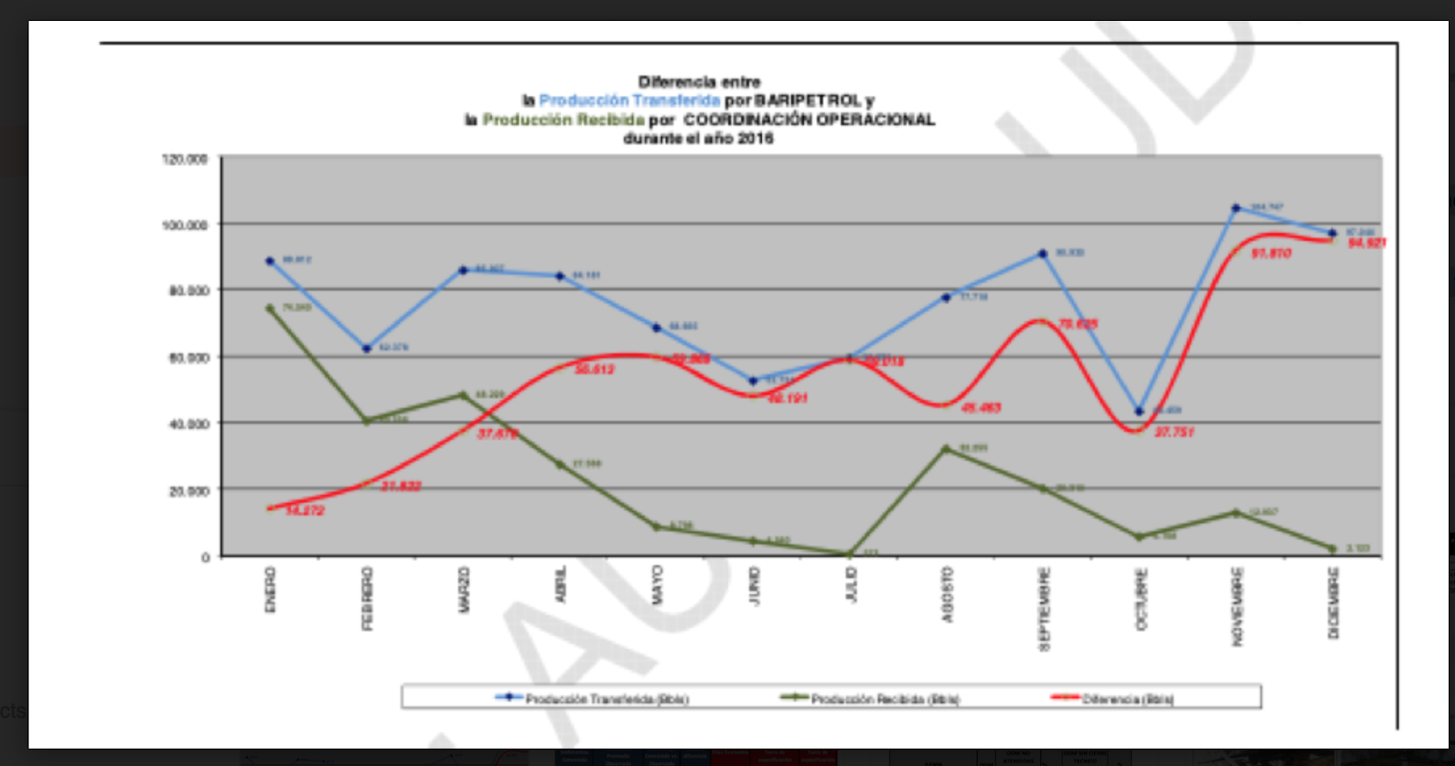 Fue en Baripetrol donde se determinó una desviación acumulada de enero a septiembre de 2016 de Bbls 413.550 (62 por ciento) entre la producción transferida desde la EF Capitán y la producción recibida en el Patio de Tanque Punta de Palmas. Los datos se recogieron de la comparación de lo reportado por la empresa mixta y la registrado en las boletas de fiscalización del Ministerio para el Poder Popular de Petróleo y Minería. Por ello se extendió el periodo de la prueba hasta diciembre de 2016 y se estableció que la diferencia al 31 de diciembre de 2016 ascendía a Bbls 638.033 con tendencia a incrementarse.