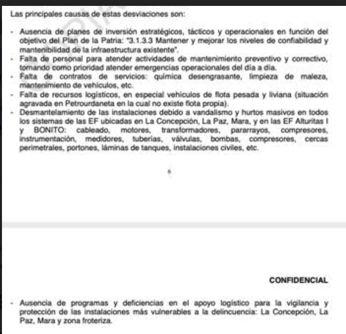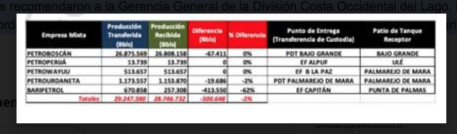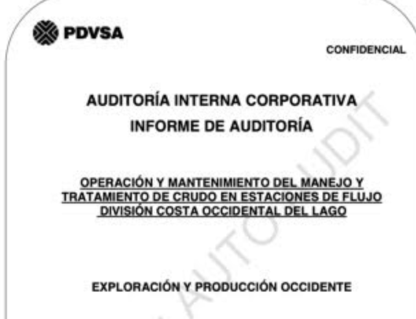 Un informe confidencial fechado en enero de 2017, signado con el número AIC-EXP-OCC-P-20-16-043, emanado de la Gerencia de Auditoría Interna Corporativa EyP de PDVSA Occidente, revela que un conjunto de irregularidades en los procesos de control interno de los procesos de operación y mantenimiento así como de tratamiento de crudo en las estaciones de flujo de la División Costa Occidental del Lago, un hecho que, según advierten, afecta la eficiencia y eficacia de las operaciones, la confiabilidad de la información y el cumplimiento de las normas que rigen tal actividad.
