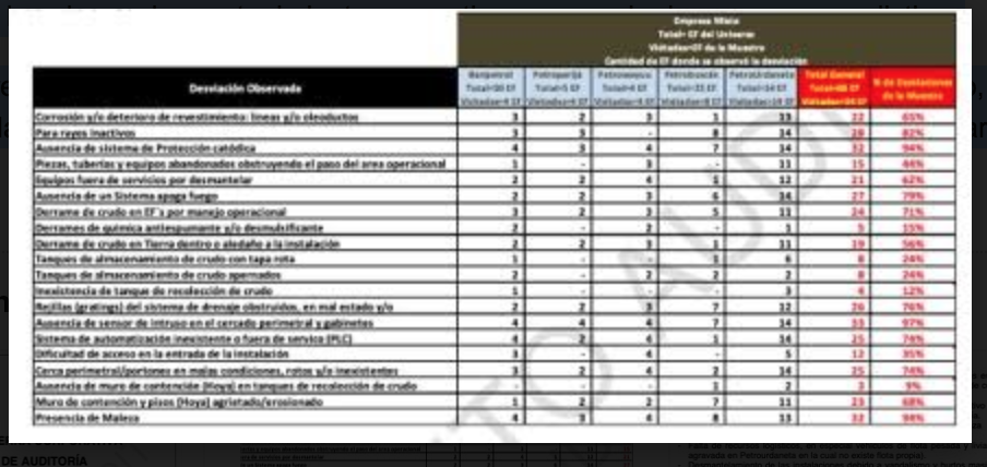 El informe elaborado por Diego Nava, Jenny Marín, Ricardo Hernández y José Camargo y que suscribe el Jhon Sánchez, gerente de AIC EyP Occidente, detectó una “limitación de las actividades de operación y mantenimiento, así como riesgo de daños a instalaciones, personas y ambiente por desviaciones observadas en promedio, en 20 de las 34 estaciones de flujo visitadas”. En específico, los auditores advirtieron deterioro de líneas y tanques, pararrayos inactivos, ausencia de protección catódica y protección contra incendios, equipos fuera de servicio por desmantelar, derrames de crudo, ausencia de sensores de intrusos, drenajes obstruidos, PLC (Programmable Logic Controller) y medidores de flujo fuera de servicio, ausencia o deterioro de cercas perimetrales, presencia de maleza, entre otras.
