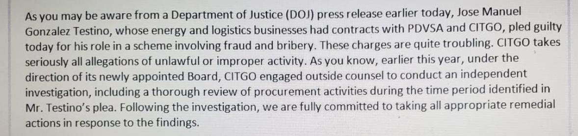 La nueva junta directiva de CITGO expresó su profunda preocupación ante el anuncio hecho el miércoles de 29 de mayo de 2019 por el Departamento de Justicia de los Estados Unidos, donde se informó que José Manuel González Testino, propietario de varias empresas de servicios y logísticas ligadas al sector energético, se declaró culpable de haber participado en un esquema de corrupción y pago de sobornos a empleados de la filial de Petróleos de Venezuela en EE. UU.