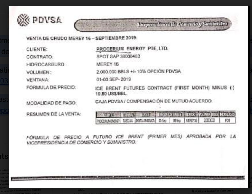 A mediados del mes de octubre, Eni Trading & Shiping Spa transportó un cargamento de un millón de barriles de Merey 16 que iban a ser intercambiados por gasolina.