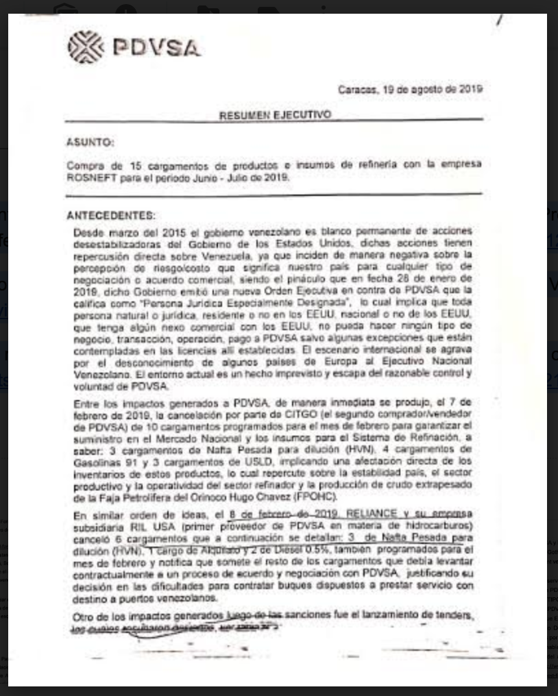 En lo que para la fecha del informe había transcurrido del año 2019, Rosneft había recibido un promedio de 14 cargamentos de crudo, es decir, USD 700 millones mensuales, USD 7.000 millones en los primeros 10.
