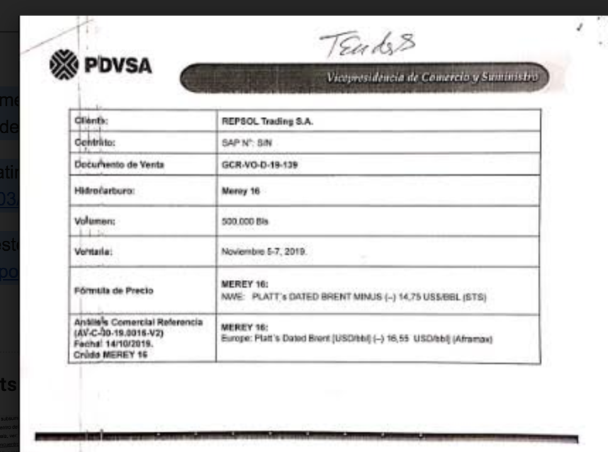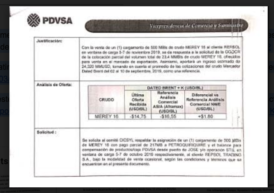 Y es que como apunta el informe, en ningún momento Repsol ha dejado de hacer negocios con PDVSA y, como prueba de ello, se refiere que para los días de la redacción del informe, la estatal venezolana le otorgó a la citada empresa un contrato de 500.000 barriles de Merey 16 para ser retirados entre el 5 y el 7 de noviembre de 2019.