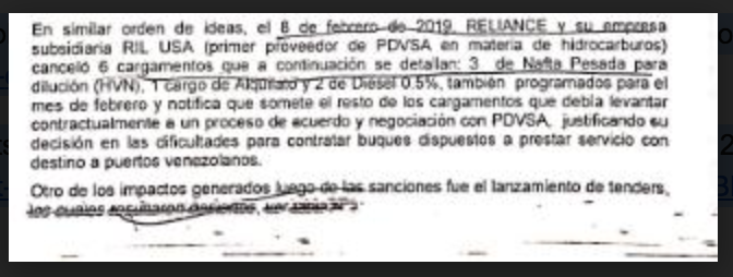 En el informe que presentamos, se cita el caso de un entramado de corrupción que tuvo lugar entre funcionarios de PDVSA y la empresa privada de la India, Reliance, una operación que se ha tratado de presentar como la constitución del país asiático como importante comprador de petróleo venezolano, cuando en realidad se trataría de una “red de corrupción” conformada especialmente para esquilmar el dinero de los venezolanos.