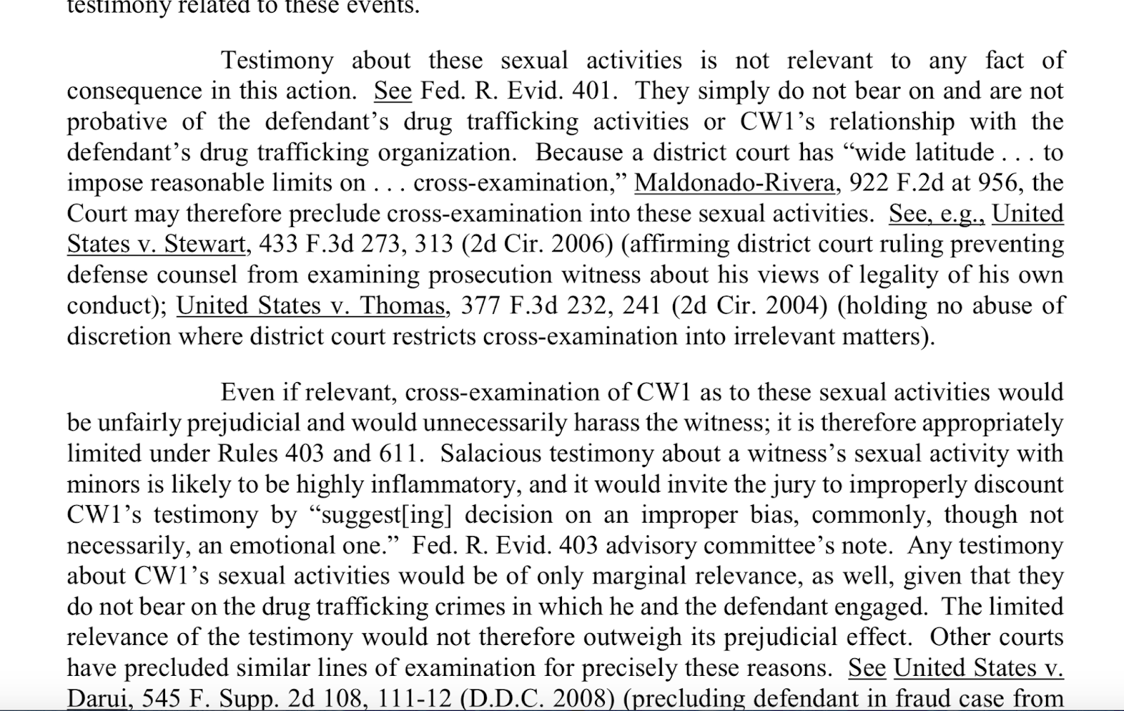 Los detalles de las revelaciones que surgieron antes de que el juez Bryan Cogan instruya al jurado sobre la norma, previsto para que se haga el lunes 4 de febrero a las 9:30 AM. Los datos que hablan sobre el uso de niñas para actos sexuales por parte de Guzmán fueron detallados por el testigo y ex secretario personal del acusado, Alex Cifuentes Villa, quien aseguró a los fiscales federales que en ocasiones ayudó al Chapo a drogar a las niñas colocando una «sustancia en polvo» en sus bebidas.