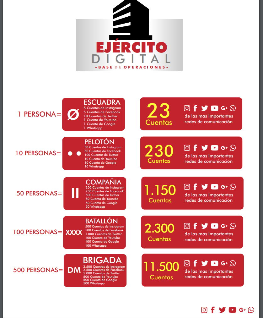 Para la conformación del Ejército Digital -base de operaciones- tiene varios componentes que están conformados por personas que tendrán, (cada una) a su disposición 23 cuentas en las principales redes sociales: Instagram, Facebook, Twitter, Youtube y Google.