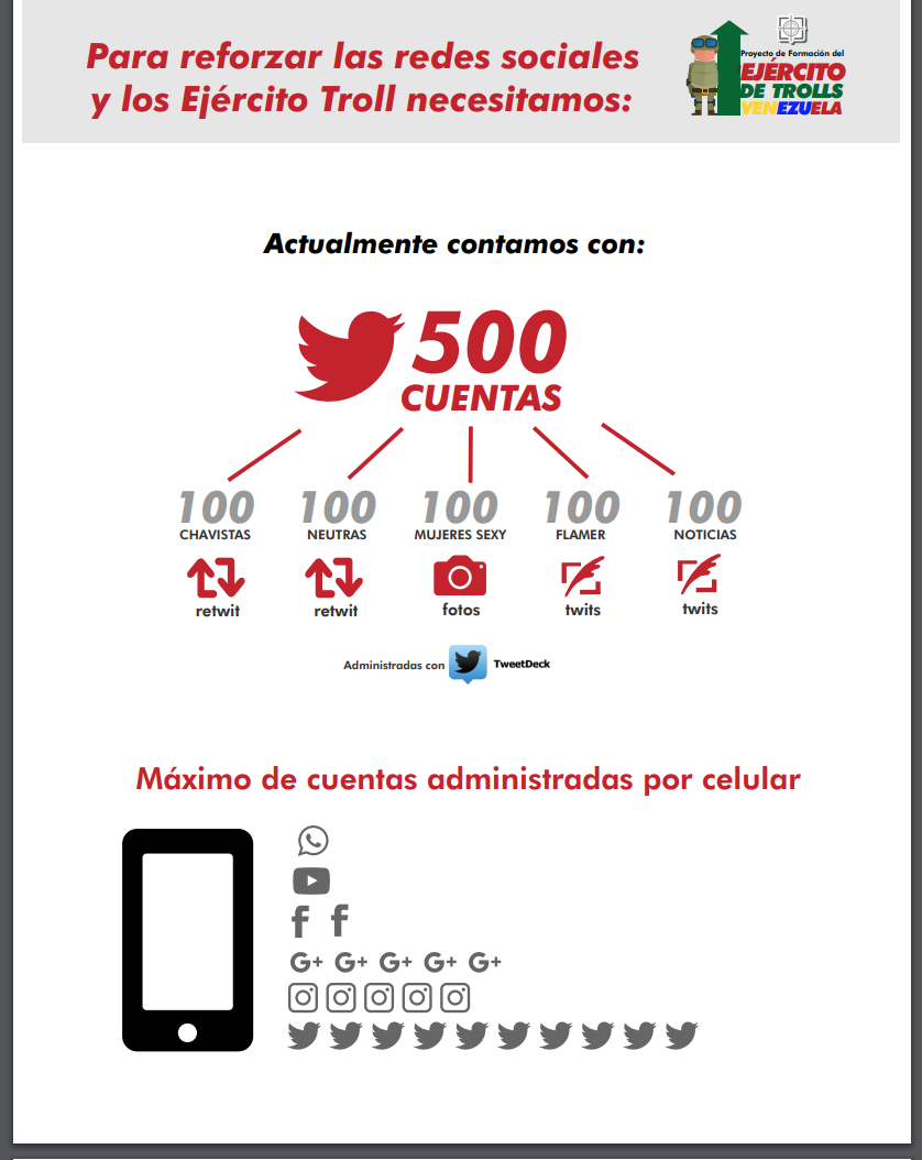El proyecto para la creación del Ejército de Trolls forma parte de las herramientas usadas por el régimen venezolano —en el marco de la llamada guerra asimétrica— para el control de la opinión pública.