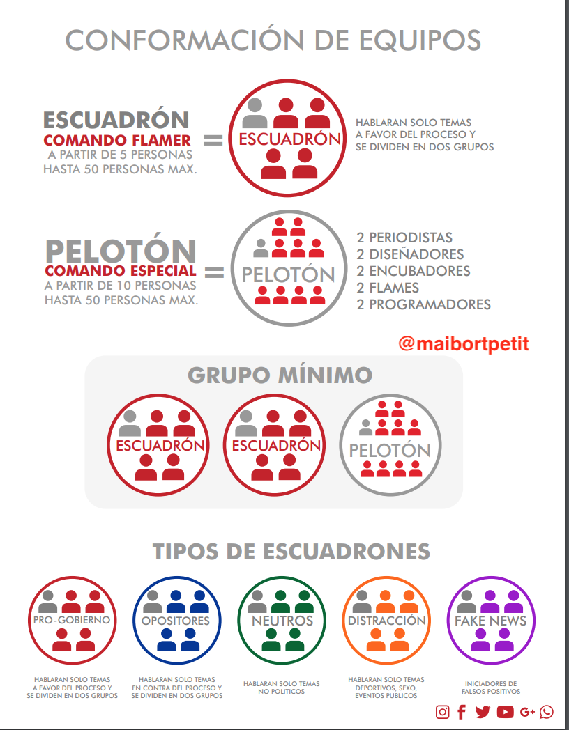 A su vez las Escuadras tendrán las siguientes responsabilidades: Prensa, diseño, sistemas, incubadores, ataques (Flames), creadores de contenidos informativos, notas de prensa, artículos y publicaciones, contenidos audiovisuales, banners, Flyers, edición de fotos, videos, creadores de aplicaciones Web para computadoras y celulares, hackers y crackers, creadores de cuentas en redes sociales que le darán humanización y personalidad a cada una de ellas, y los incitadores y creadores de falsos positivos para confundir a las audiencias.