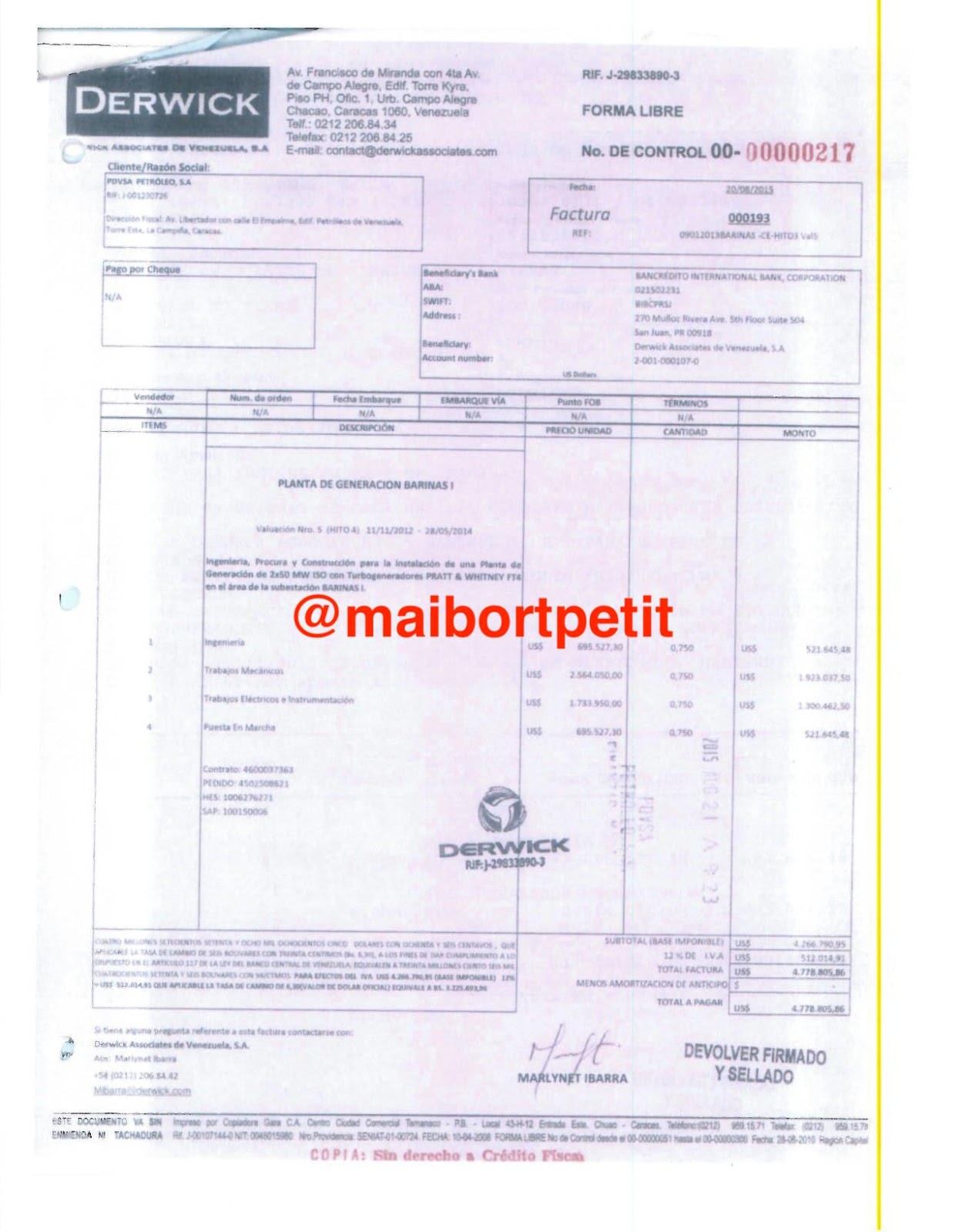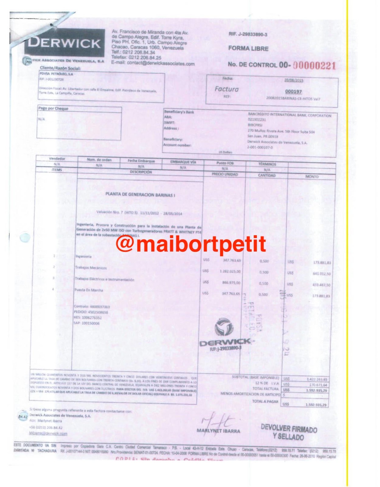 Al 16 de mayo de 2016, el representante legal de Derwick, Luis Pérez, remitió a Petróleos de Venezuela S.A. (PDVSA), a la atención de Freddy Corao de la Dirección Ejecutiva de Tesorería de la estatal venezolana, una carta de reconsideración de asignación de montos en intercambio de deuda comercial por Notas Promisorias.