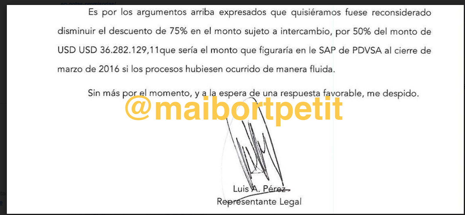 “Es por los argumentos arriba expresados que quisiéramos fuese reconsiderado disminuir el descuento de 75% en el monto sujeto a intercambio, por 50% del monto de USD 36.282,129,11 que sería el monto que figuraría en le SAP de PDVSA al cierre de marzo de 2016 si los procesos hubiesen ocurrido de manera fluida”.