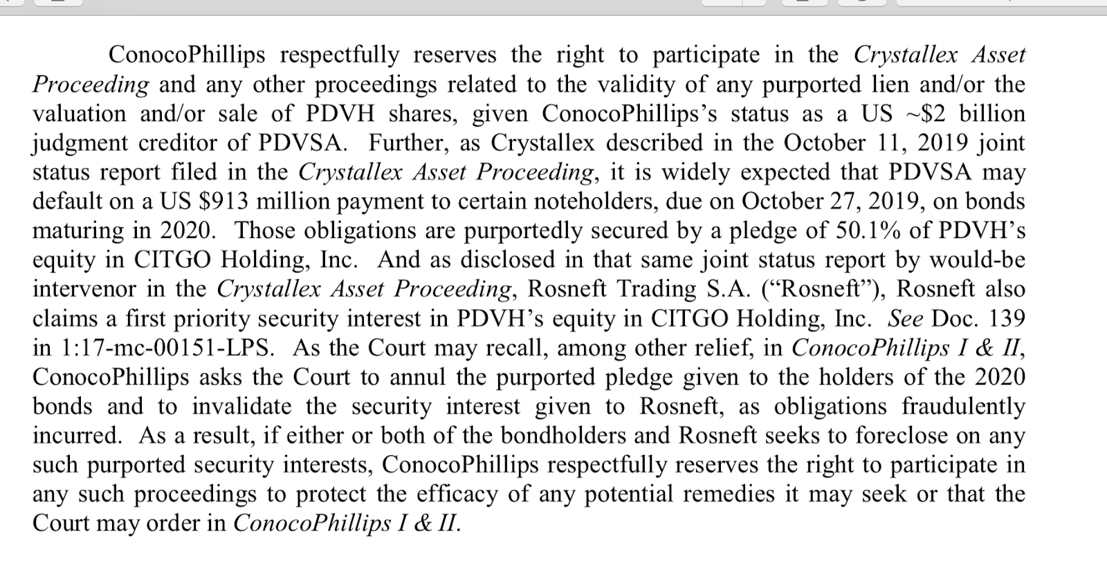 En consecuencia, ConocoPhillips se reserva además el derecho de participar en cualquier procedimiento como resultado de su condición de acreedor multimillonario de PDVSA y ROV.