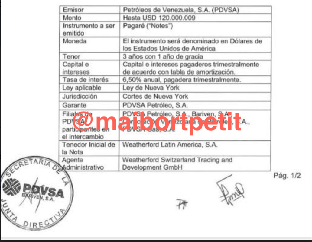 El comunicado instruía a la filial, a que adoptara las acciones necesarias para materializar la decisión de la junta directiva de intercambiar la deuda comercial que mantenía con el proveedor antes referido —Weatherford Latin America S.A.— en deuda financiera, mediante la emisión de un pagaré por parte de PDVSA por USD 120.000.0009 que sería intercambiados por facturas comerciales de Bariven S.A.