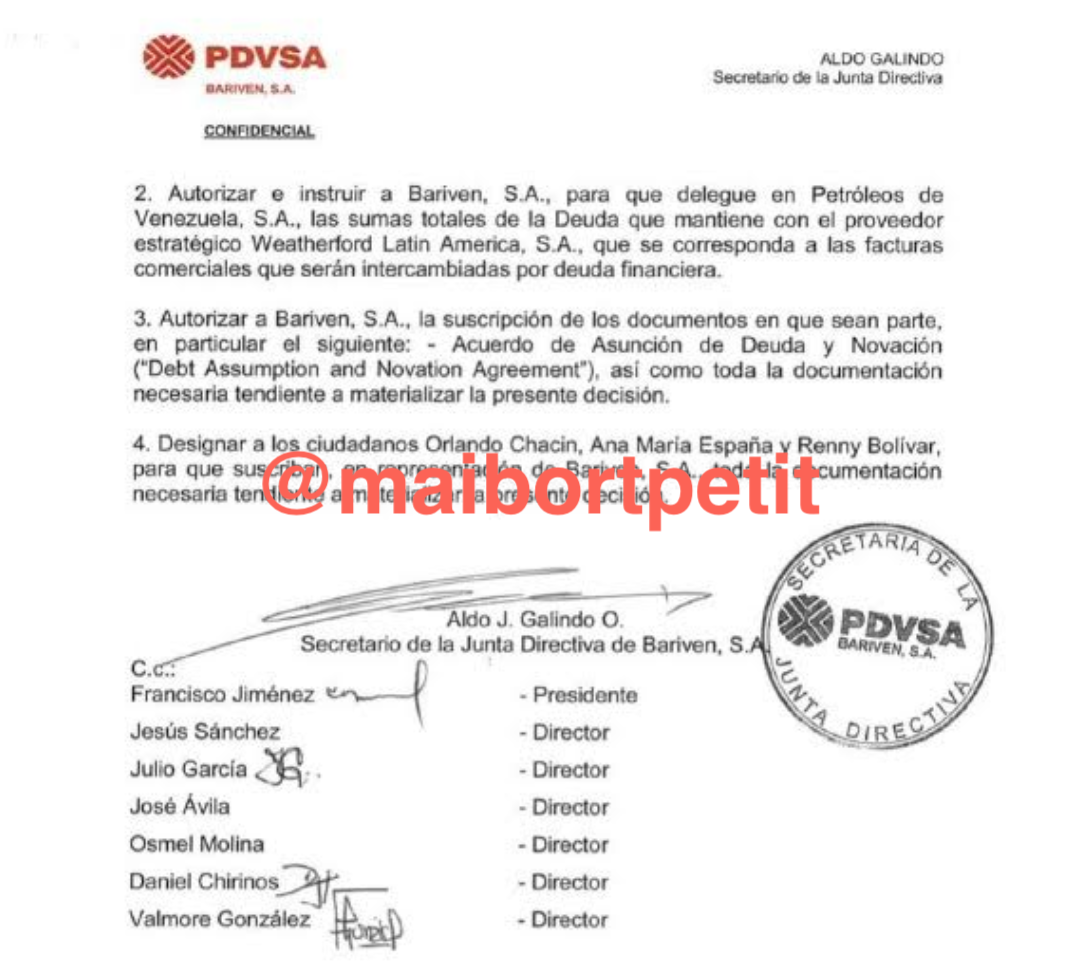 El 26 de mayo de 2016, Aldo Walindo, secretario de la junta directiva de Bariven S.A., remitió a Francisco Jiménez, presidente de la filial petrolera para la época, una comunicación confidencial relativa a la decisión adoptada por el directorio en su reunión número 09-2016 de autorizar la operación de intercambio de deuda comercial en deuda financiera de Petróleos de Venezuela S.A. y filiales mediante la emisión de pagaré a favor de la empresa Weatherford Latin America S.A.,
