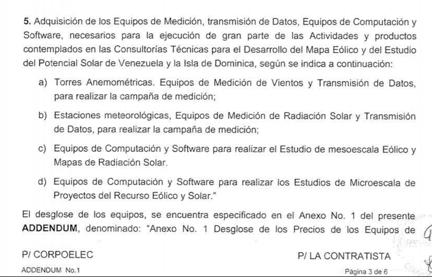 Este Addendum extendía la cláusula de objeto del contrato y le agregaba un quinto punto referido a la adquisición de equipos de medición, transmisión de datos, equipos de computación y software y se describen las características de cada equipo enumerado como se ve en la imagen: