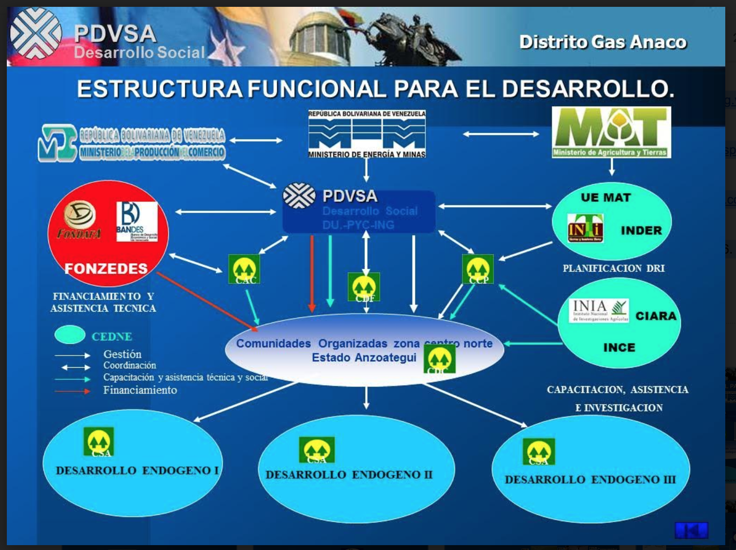 La estructura organizativa estaba conformada por Luis Pulido (gerente Oriente), Bárbara Palacio (gerente de desarrollo social), Wenceslao Madail (gerente distrito Anaco), Jorge Romero (superintendente de desarrollo social), Eva Arratia (coordinadora administrativa) y Claudio Ramírez (coordinador operacional).