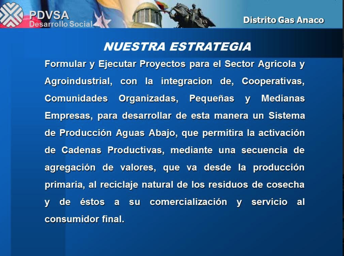 La estrategia: La consecución del objetivo planteado requiere una estrategia que, de acuerdo a lo planteado por el Ministerio de Energía y Minas y PDVSA Social, era formular y ejecutar proyectos para el sector agrícola y agroindustrial a los cuales se integren cooperativas, comunidades organizadas, pequeñas y medianas empresas con miras a desarrollar un sistema de producción aguas abajo que permitiría la activación de cadenas productivas. Dicha activación se plantean lograrla mediante el fomento de la producción primaria, el reciclaje natural de los residuos de cosecha que deriven a su comercialización y servicio al consumidor final.