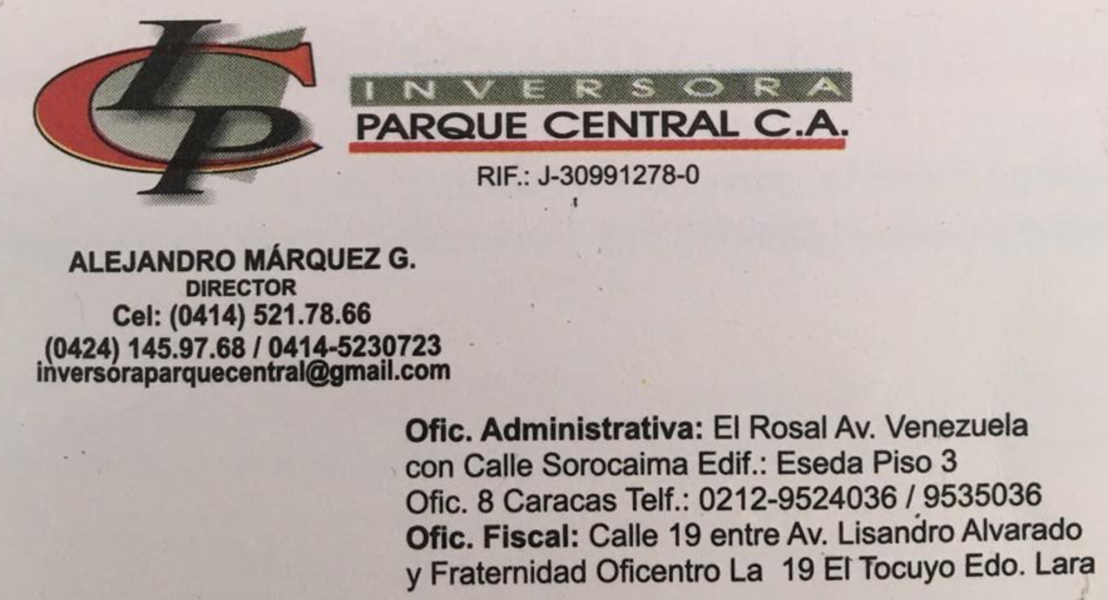 Alejandro Márquez González es director de la empresa Inversora Parque Central C.A., cuyo Registro de Información Fiscal (RIF) es J-30991278-0, la cual tiene su sede administrativa en la avenida Venezuela con calle Sorocaima de El Rosal, edificio Eseda, piso 3, oficina 8. Teléfonos: 0212-9524036 y 6535036. Correo electrónico: inversoraparquecentral@gmail.com.