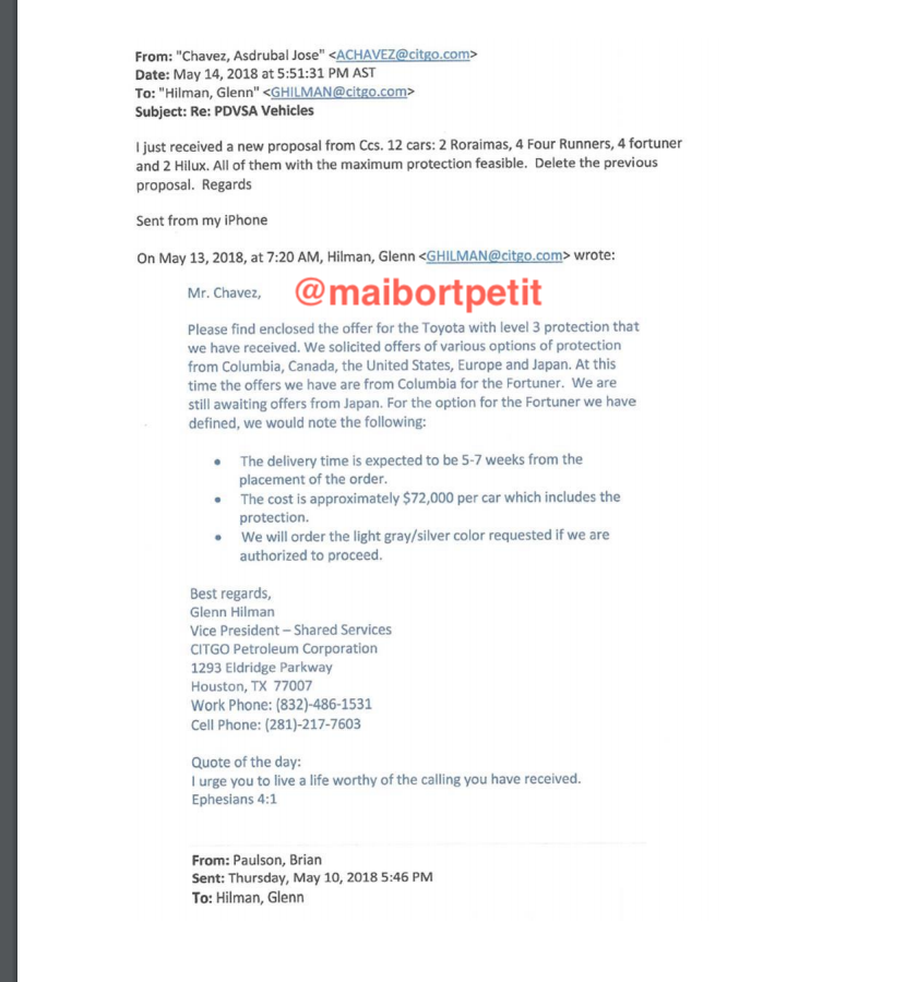 En mayo de 2018, el director de compras de CITGO, Glenn Hilman, y los gerentes Brian Paulson, Laymar Peña apoyaron el proceso de la compra de vehículos blindados autorizado por  Chávez y  Quevedo.