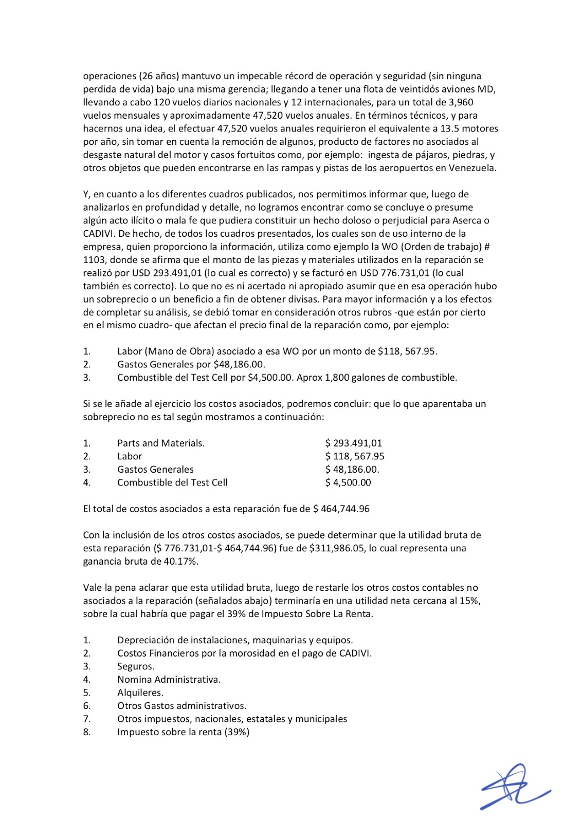 Simeón García advierte la importancia de revisar los costos de los motores, partes y consumibles de las aerolíneas para la fecha aludida en el trabajo periodístico, asegurando que con relación a otras líneas aéreas venezolanas que operan con el mismo modelo de avión, Aserca Airlines refleja el más bajo del mercado, como también lo hace con respecto a partes y consumibles de mantenimiento.