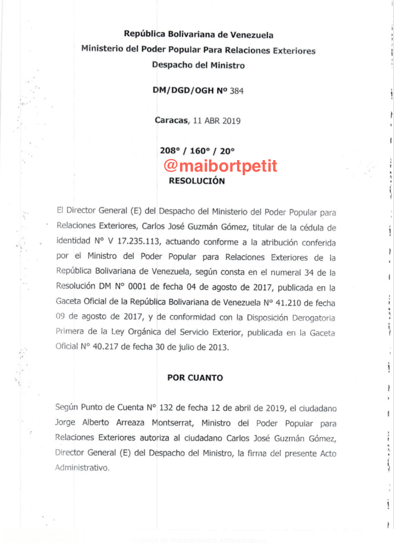 De acuerdo a la Resolución DM/DGD/OGH N-384, el director general (e) del despacho del Ministerio Popular de Relaciones Experiores, Carlos José Guzmán Gómez informa que el 12 d abril de 2019, el canciller Jorge Arreaza Monsserrat (según el punto de cuenta N-132 de fecha 12 de abril de 2019), autorizó a Carlos José Guzmán Gómez a trasladar a la segundo secretario en comisión Marcella Camero Montañez, titular de la cédula V-16.113.356, de la Misión Permanente de la República Bolivariana de Venezuela acreditada ante la Organización de los Estados Americanos (OEA), con sede Washington, a la Misión Permanente de la República Bolivarina de Venezuela ante la Organización de Naciones Unidas (ONU) con sede en Nueva York, designándole como Consejero en Comisión.