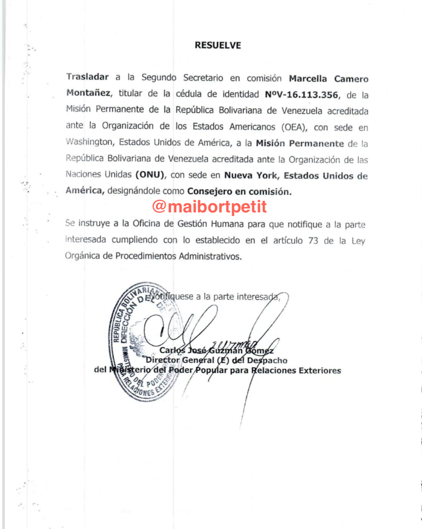 De acuerdo a la Resolución DM/DGD/OGH N-384, el director general (e) del despacho del Ministerio Popular de Relaciones Experiores, Carlos José Guzmán Gómez informa que el 12 d abril de 2019, el canciller Jorge Arreaza Monsserrat (según el punto de cuenta N-132 de fecha 12 de abril de 2019), autorizó a Carlos José Guzmán Gómez a trasladar a la segundo secretario en comisión Marcella Camero Montañez, titular de la cédula V-16.113.356, de la Misión Permanente de la República Bolivariana de Venezuela acreditada ante la Organización de los Estados Americanos (OEA), con sede Washington, a la Misión Permanente de la República Bolivarina de Venezuela ante la Organización de Naciones Unidas (ONU) con sede en Nueva York, designándole como Consejero en Comisión.