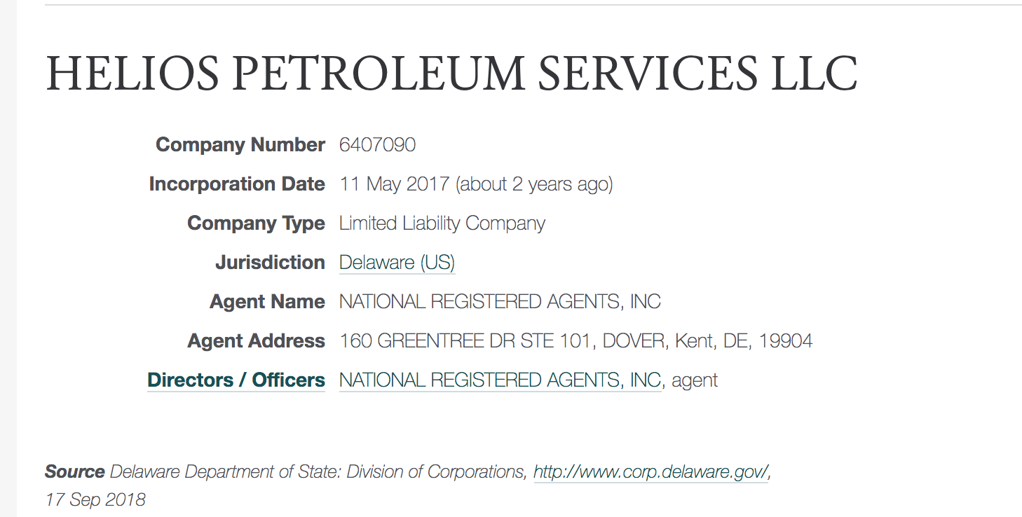 En relación a la segunda empresa vinculada a Samark López, Helios Petroleum Services LLC aparece una con el número 6407090, creada el 11 de mayo de 2017 en Delaware, registrada por National Registered Agents INC con la dirección 160 Greentree Dr. Suite 101, Dover, Kent, DE, 19904.(8)