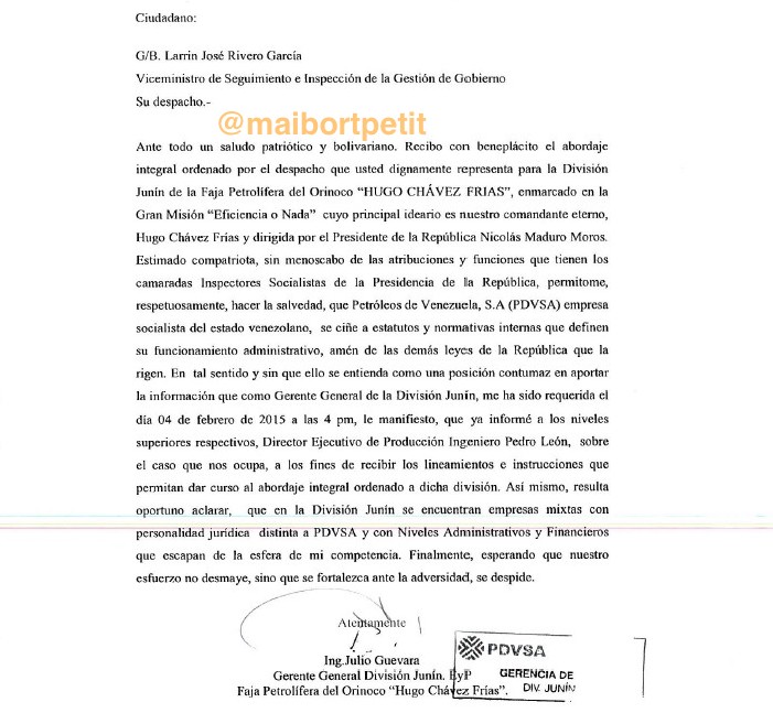 El 5 de febrero de 2015, Julio Guevara, gerente general de la División Junín remitió una comunicación al viceministro de Seguimiento e Inspección de la Gestión de Gobierno, G/B Larrín José Rivero García, para advertir que “sin menoscabo de las atribuciones y funciones que tienen los camaradas Inspectores Socialistas de la Presidencia de la República, permítome, respetuosamente, hacer la salvedad, que Petróleos de Venezuela, S.A (PDVSA) empresa socialista del estado venezolano, se ciñe a estatutos y normativas internas que definen su funcionamiento administrativo, amén de las demás leyes de la República que la rigen. En tal sentido y sin que ello se entienda como una posición contumaz en aportar la información que como Gerente General de la División Junín, me ha sido requerida el día 04 de febrero de 2015 a las 4 pm, le manifiesto, que ya informé a los niveles superiores respectivos, Director Ejecutivo de Producción Ingeniero Pedro León, sobre el caso que nos ocupa, a los fines de recibir los lineamientos e instrucciones que permitan dar curso al abordaje integral ordenado a dicha división”.