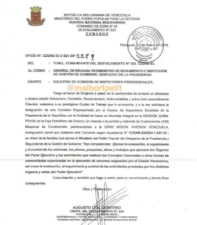 En la misma fecha, 23 de enero de 2015, el Comando de Zona N° 52, Destacamento N° 524 de la Guardia Nacional Bolivariana a cargo de Augusto Leal Quintero, dirigió el oficio N° CZGNB-52-D-524-SIP-0012 al general de brigada viceministro de seguimiento e inspección de gestión de gobierno del despacho de la presidencia para solicitar la designación de una Comisión Representada por el Cuerpo de Inspectores Socialista de la Presidencia de la República para hacer “un Abordaje Integral en la División Junín-PDVSA de la Faja Petrolífera del Orinoco, en relación a la perdida y extravió de Cuatrocientas (400) Maquinas de Construcción, pertenecientes e la Gran Misión Vivienda Venezuela”.