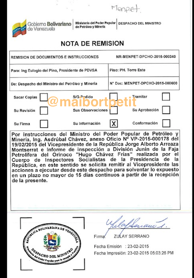 Arreaza también se dirigió ese mismo día 19 de febrero de 2015, a Carlos Alberto Osorio Zambrano, ministro del Poder Popular del Despacho de la Presidencia y Seguimiento de la Gestión de Gobierno, mediante oficio con copia al ministro de Petróleo y Minería, Asdrúbal Chávez y a Larrín José Rivero García, viceministro de Seguimiento e inspección de la Gestión de Gobierno del Ministerio del Poder Popular del Despacho de la Presidencia y Seguimiento de la Gestión de Gobierno, para solicitar llevar a cabo una inspección integral y exhaustiva de la División Junín de la Faja Petrolífera del Orinoco «Hugo Chávez Frías».