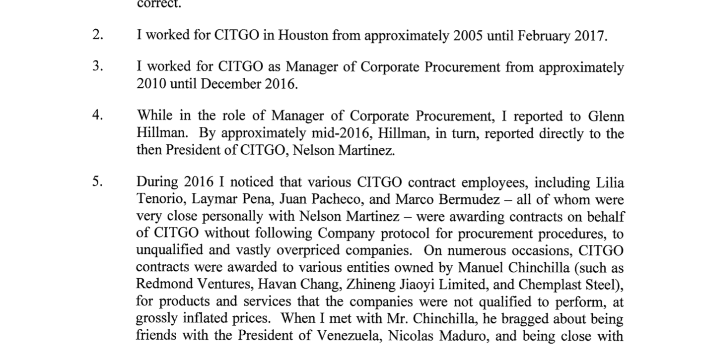 La información fue dada a conocer en una declaración jurada presentada ante la Corte del Distrito Harris en Texas por Carlie Neubauer, quien trabajó para CITGO desde 2005 hasta febrero de 2017, como Gerente de Compras Corporativas y quien era responsable directo de todas las actividades de compras corporativas de CITGO, que incluían los terminales y tuberías, lubricantes y corporativos desde 2010 hasta 2016. La ex-ejecutiva renunció a la filial de PDVSA en Estados Unidos luego que fue removida de su puesto y degradada por haber denunciado ante la alta gerencia varios casos que violaban la normativa corporativa y leyes federales de los EE.UU., durante la presidente de Nelson Martínez(*fallecido en custodia del Estado venezolano).