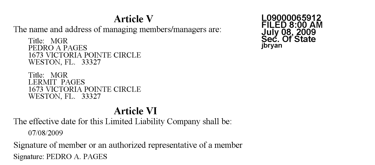 A través de un acto de disolución la empresa concluyó su actividad el 26 de septiembre de 2014. El agente registrador for el escritorio jurídico ROZENCWAIG & NADEL, LLP 301 W. Hallandale Beach Blvd. Hallandale Beach, FL 33009.